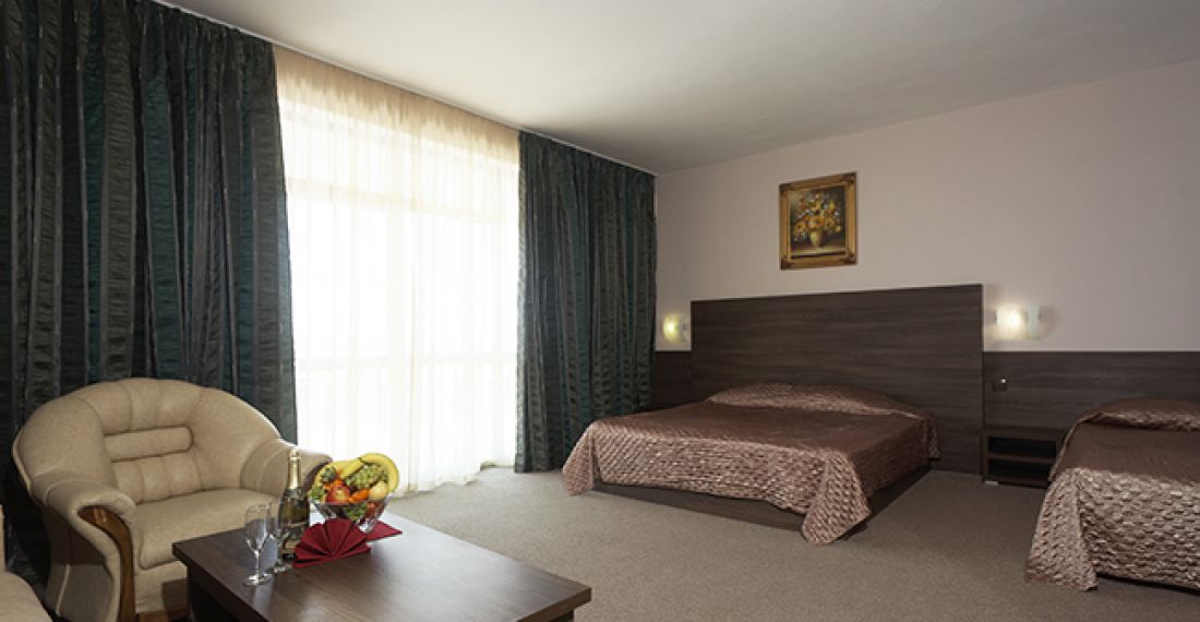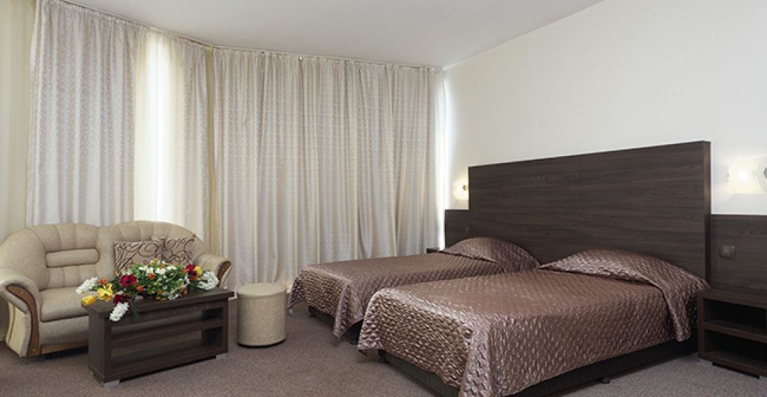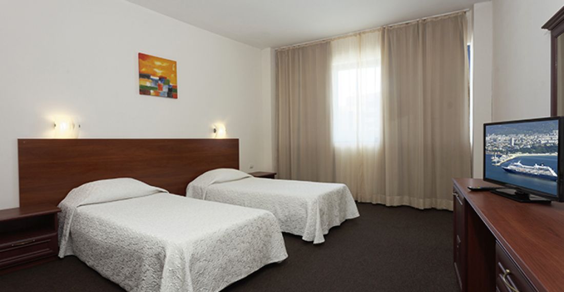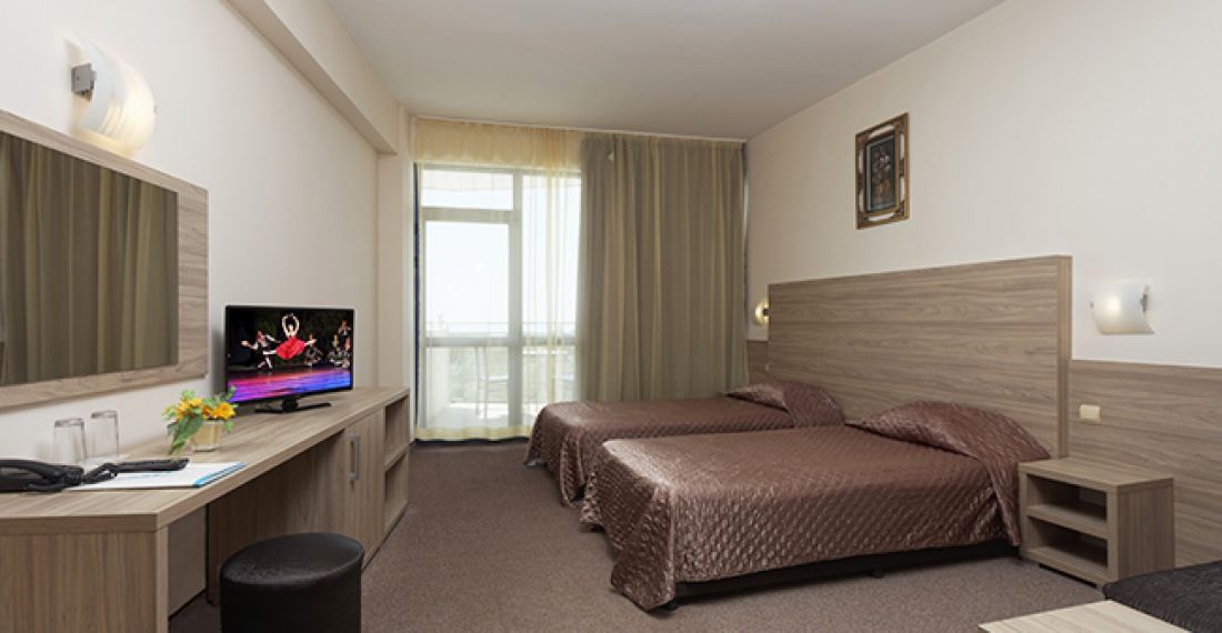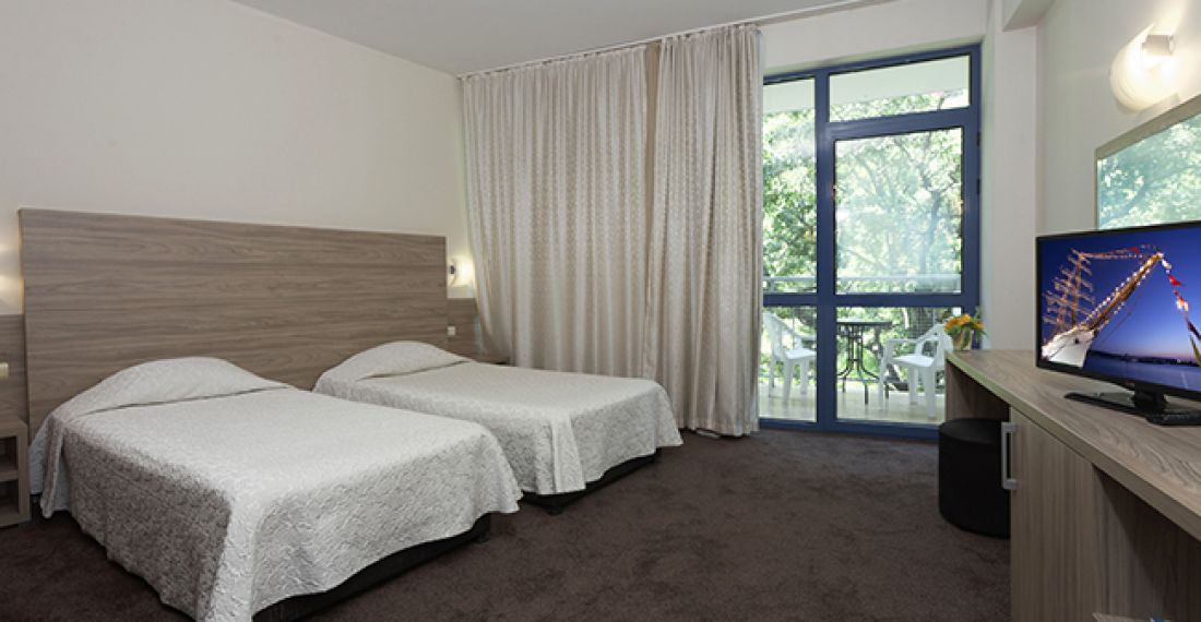 ▪ Двойна: страна море или парк. Обща площ – приблизително 32 кв.м; две легла с размер 2м/1м, с възможност за обединяване като спалня; диван или допълнително легло, хладилник (мини бар - опционално/допълнително заплащане/; Сат ТВ; телефон с
